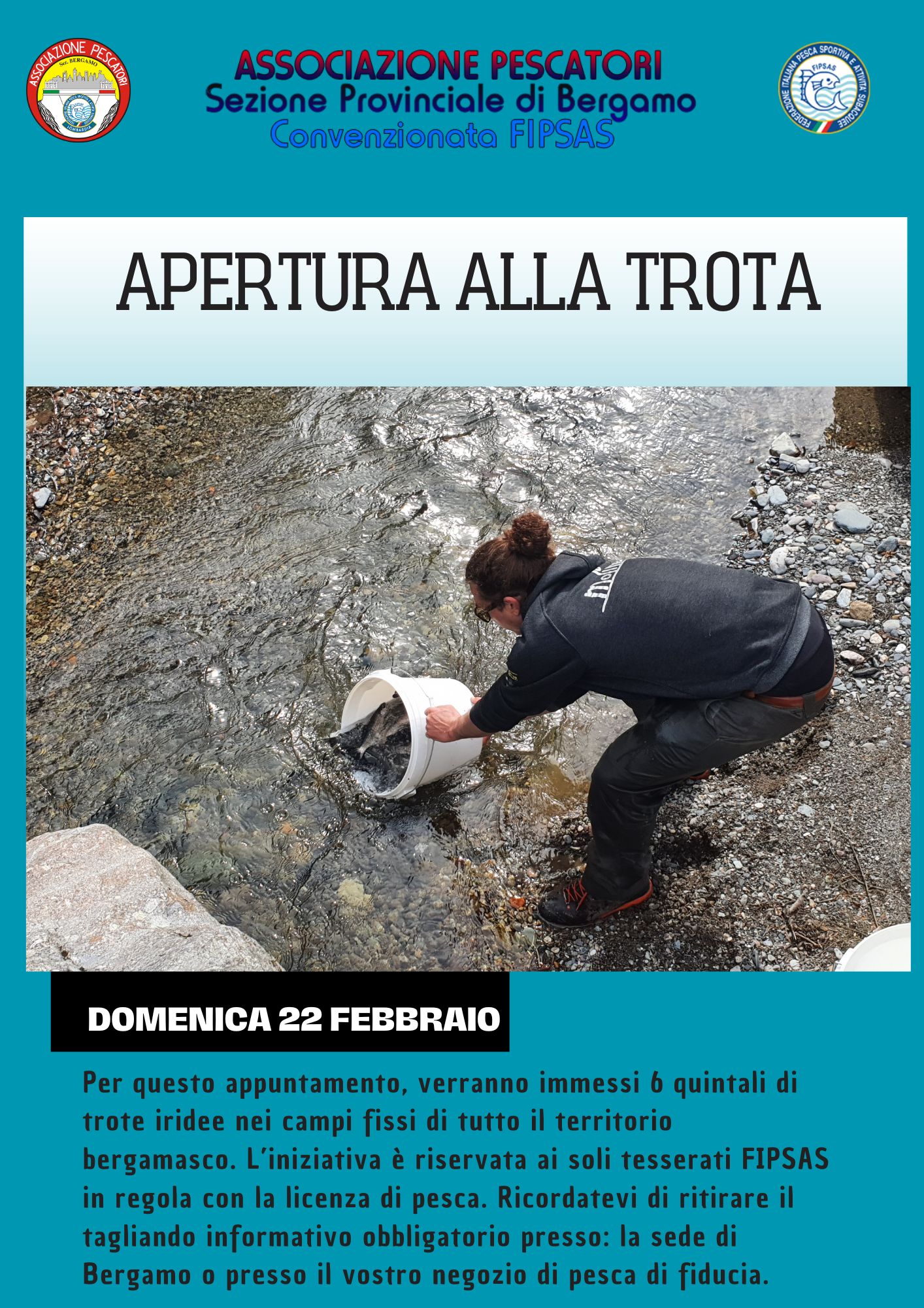 Il countdown è iniziato: domenica 22 febbraio si apre ufficialmente la stagione della trota e l’Associazione Pescatori Bergamo FIPSAS ha deciso ancora una volta rispondere presente.
